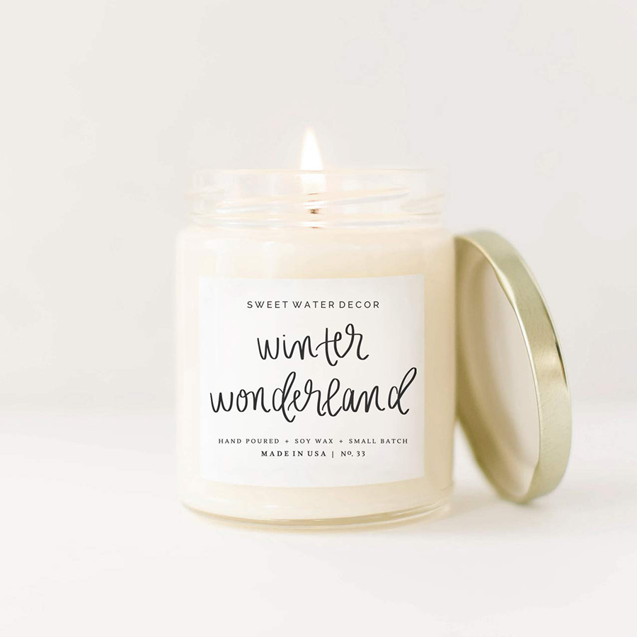 Keeping with our stay warm theme, candles can add a small glow and nice scent for the darker days in January. Look for neutral colors with pretty writing – here we show a winter white.