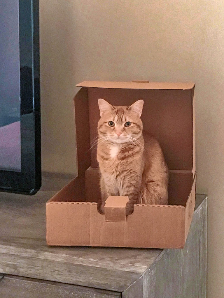 While this deceiving photo shows Millie containing herself in a box, her real life tells a different story as she can often be found at eye level ( on tables) and above (tops of cabinets) at any given time.